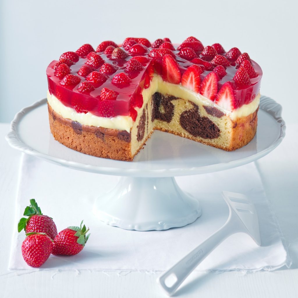 Ak radi pečiete, tu je náš tip na chutný mramorový koláč. Na cesto budete potrebovať tieto prísady: 1 balenie bábovky, 150 g zmäknutého masla alebo margarínu, 2 vajcia, 350 ml mlieka, 2 PL kakaa a 1 PL mlieka na tmavé cesto. Na náplň: asi 600 g jahôd, 1 balíček pudingu bez varenia s vanilkovou príchuťou a 300 ml mlieka. Na želé: 1 balíček tortového želé červeného, 2 zarovnané PL cukru a 250 ml vody.